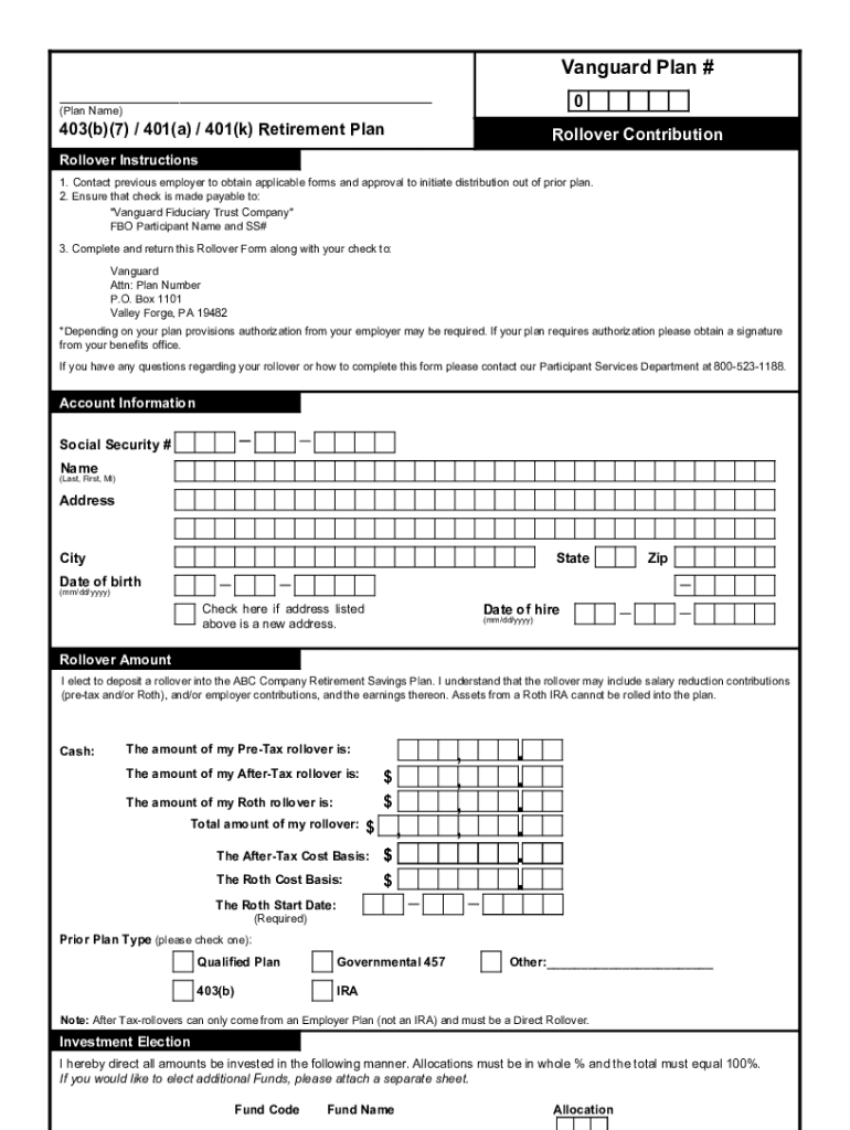 Vanguard Plan # 0(Plan Name)403(b)(7) / 401(a) / 401(k) Retirement PlanRollover ContributionRollover Instructions 1. Contact previous employer to obtain applicable forms and approval to initiate distribution
