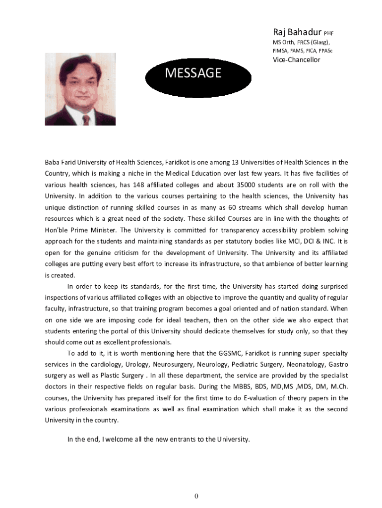 Raj Broader PhD MS North, FRS (Glass), FI MSA, FANS, FICA, FPAScViceChancellorMESSAGEBaba Farid University of Health Sciences, Haricot is one among 13 Universities of Health Sciences in the Country,