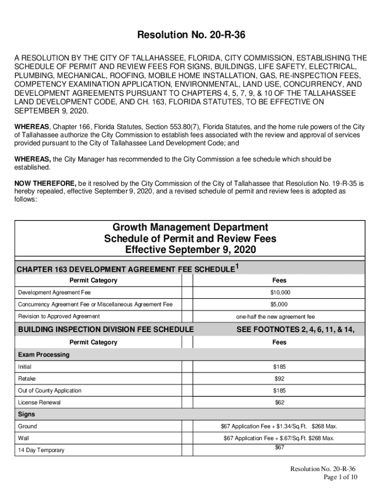 Resolution No. 20R36 A RESOLUTION BY THE CITY OF TALLAHASSEE, FLORIDA, CITY COMMISSION, ESTABLISHING THE SCHEDULE OF PERMIT AND REVIEW FEES FOR SIGNS, BUILDINGS, LIFE SAFETY, ELECTRICAL, PLUMBING,