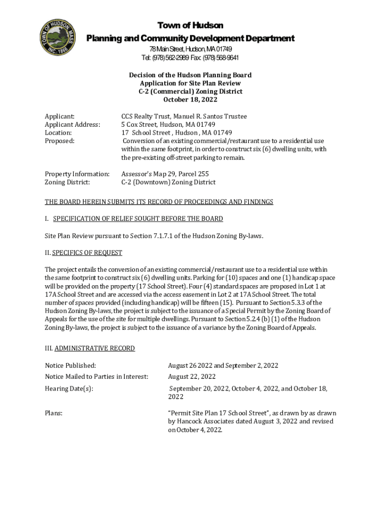 Town of Hudson Planning and Community Development Department 78 Main Street, Hudson, MA 01749 Tel: (978) 5622989 Fax: (978) 5689641 Decision of the Hudson Planning Board Application for Site Plan