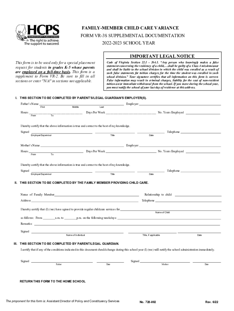 FAMILYMEMBER CHILD CARE VARIANCE FORM VR3S SUPPLEMENTAL DOCUMENTATION 20222023 SCHOOL YEAR IMPORTANT LEGAL NOTICE Code of Virginia Section 22.1 264.1. Any person who knowingly makes a false statement