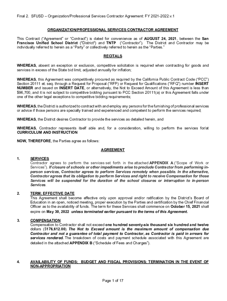 Final 2. SF USD Organization/Professional Services Contractor Agreement: FY 20212022.v.1 ORGANIZATION/PROFESSIONAL SERVICES CONTRACTOR AGREEMENT This Contract (Agreement or Contract) is dated for
