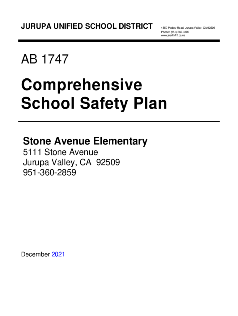 JURUPA UNIFIED SCHOOL DISTRICT4850 Medley Road, Jurupa Valley, CA 92509 Phone: (951) 3604100 www.jusd.k12.ca.usAB 1747Comprehensive School Safety Plan Stone Avenue Elementary 5111 Stone Avenue Jurupa
