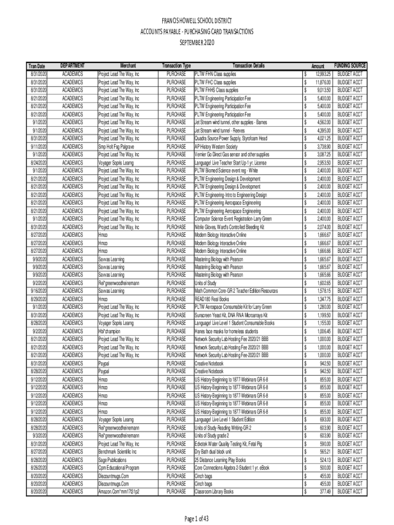 FRANCIS HOWELL SCHOOL DISTRICT ACCOUNTS PAYABLE PURCHASING CARD TRANSACTIONS SEPTEMBER 2020 Tran Date 8/31/2020 8/31/2020 8/31/2020 8/21/2020 8/21/2020 8/21/2020 9/1/2020 9/1/2020 8/31/2020 9/11/2020