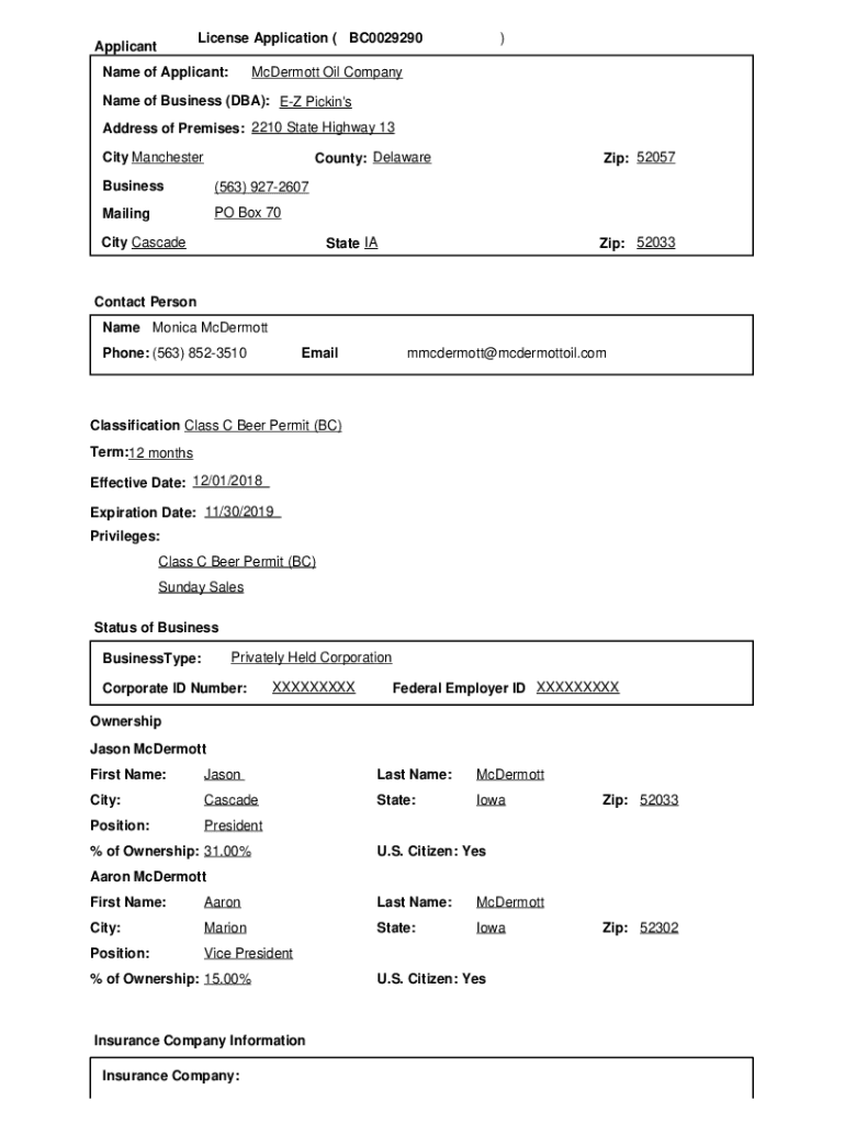 License Application (BC0029290ApplicantName of Applicant:)McDermott Oil CompanyName of Business (DBA): EZ Picking\'s Address of Premises: 2210 State Highway 13 City Manchester County: Delaware : Business