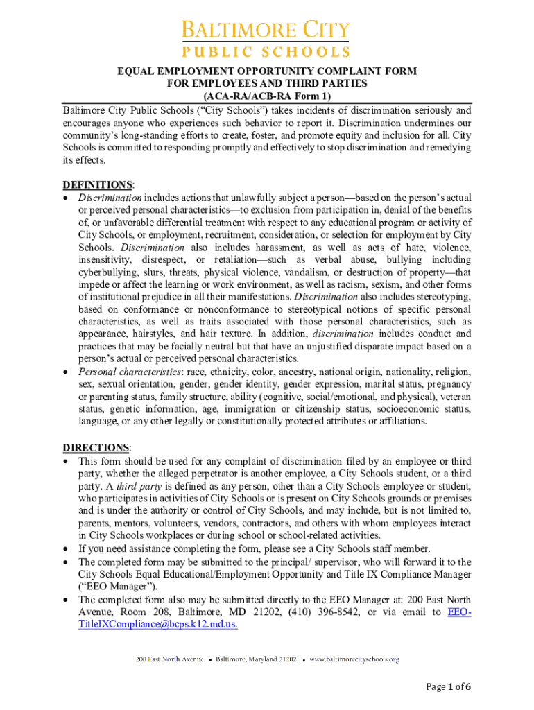 EQUAL EMPLOYMENT OPPORTUNITY COMPLAINT FORM FOR EMPLOYEES AND THIRD PARTIES (ACCRA/ACCRA Form 1) Baltimore City Public Schools (City Schools) takes incidents of discrimination seriously and encourages