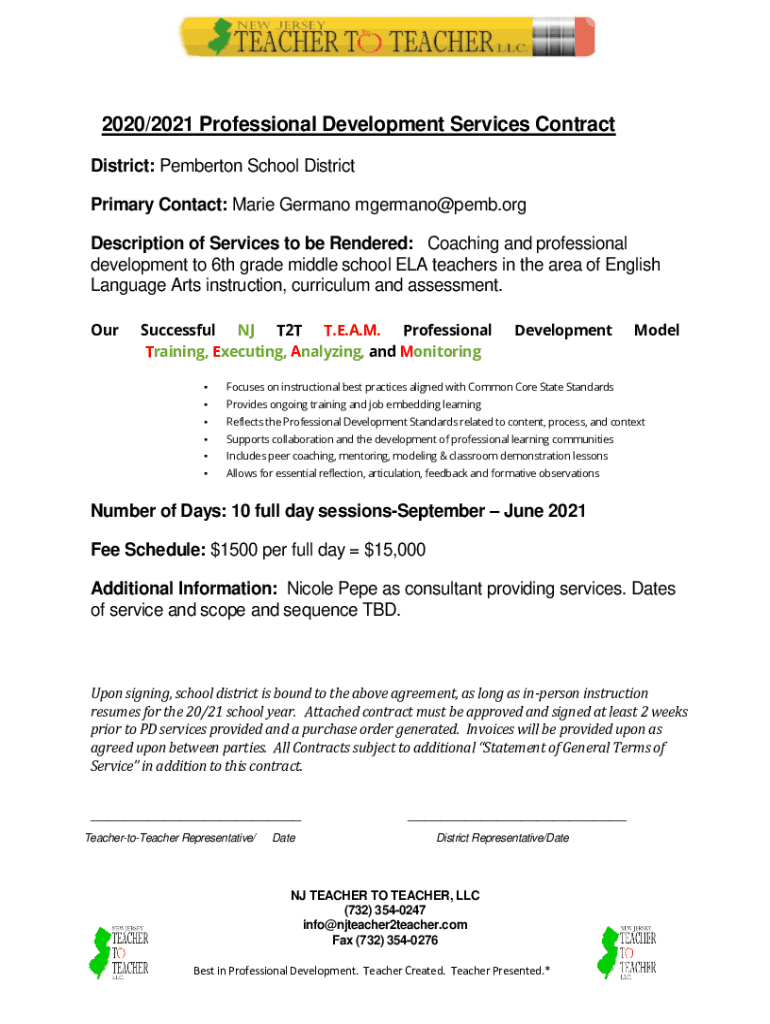 2020/2021 Professional Development Services Contract District: Pemberton School District Primary Contact: Marie German mgermano@pemb.org Description of Services to be Rendered: Coaching and professional