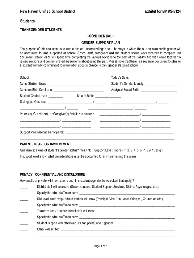 New Haven Unified School DistrictExhibit for BP #S5124Students TRANSGENDER STUDENTS CONFIDENTIAL GENDER SUPPORT PLAN The purpose of this document is to create shared understandings about the ways
