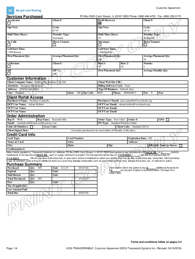 Customer AgreementServices Purchased PO Box 5505 Carol Stream, IL 601975505 Phone: (888) 4464733 Fax: (866) 2263175AcceleratorClient #:Profit RecoveryClient #:Opt Text:Opt Text:Hold Time (Days):