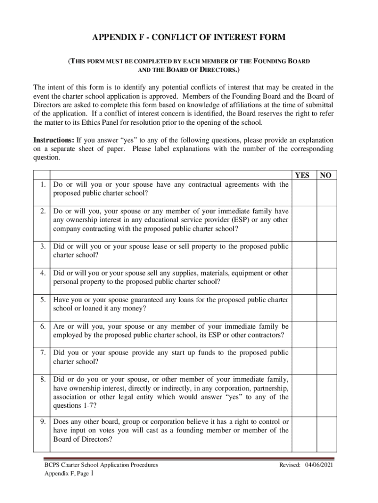 Appendix F - Conflict is a form used to disclose any potential conflicts of interest that may arise in a business or organization.