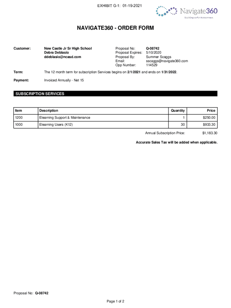 EXHIBIT G1: 01192021NAVIGATE360 ORDER FORMProposal No: Proposal Expires: Proposal By: Email: Opp Number:Q08742 5/10/2020 Summer Scags sscaggs@navigate360.com 114529Customer:New Castle Jr Sr High School