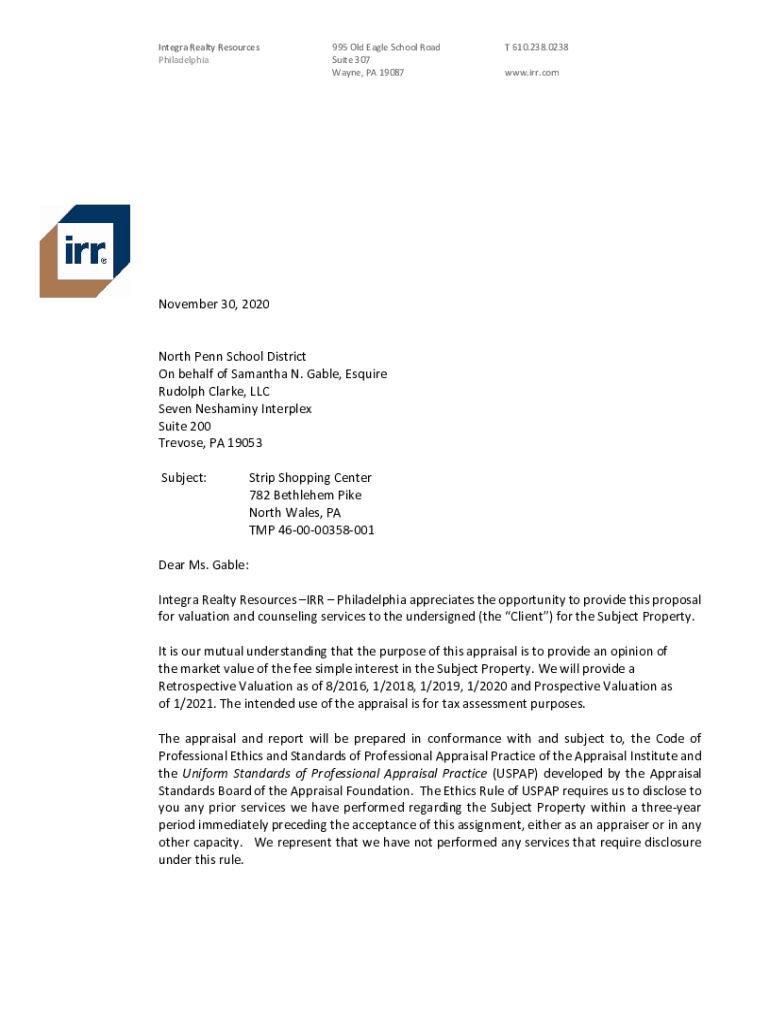 Integral Realty Resources Philadelphia995 Old Eagle School Road Suite 307 Wayne, PA 19087T 610.238.0238 www.irr.comNovember 30, 2020 North Penn School District On behalf of Samantha N. Gable, Esquire