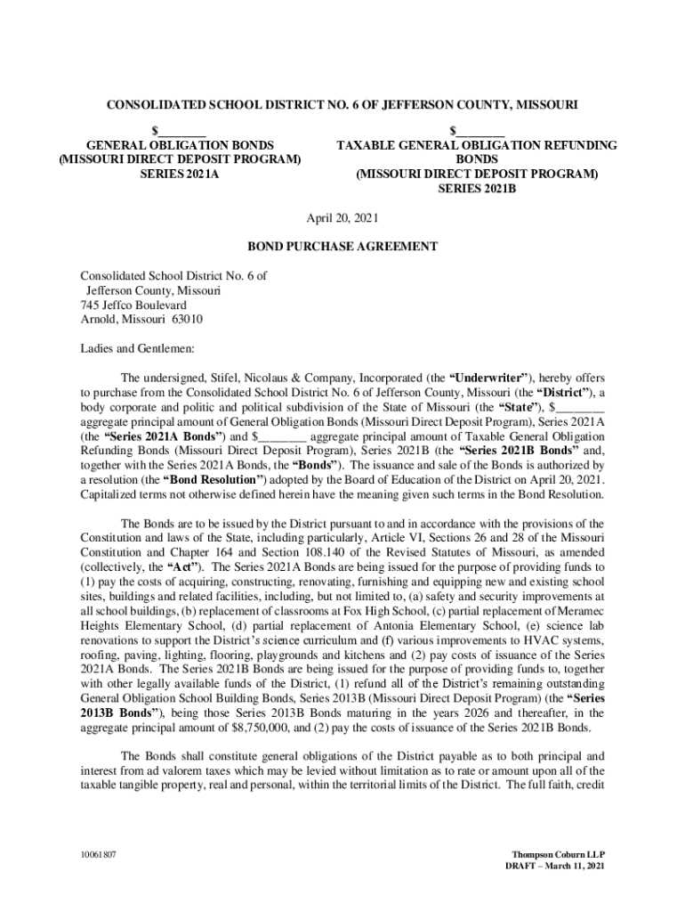 CONSOLIDATED SCHOOL DISTRICT NO. 6 OF JEFFERSON COUNTY, MISSOURI $___ GENERAL OBLIGATION BONDS (MISSOURI DIRECT DEPOSIT PROGRAM) SERIES 2021A$___ TAXABLE GENERAL OBLIGATION REFUNDING BONDS (MISSOURI