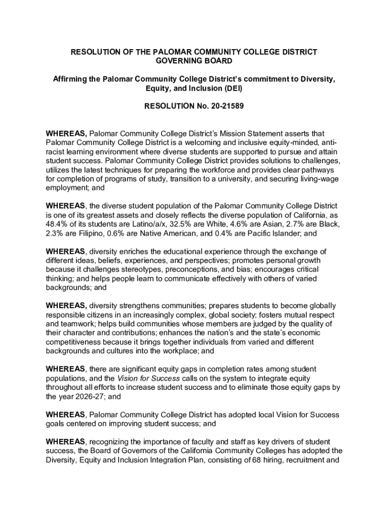 RESOLUTION OF THE PALOMAR COMMUNITY COLLEGE DISTRICT GOVERNING BOARD Affirming the Palomar Community College Districts commitment to Diversity, Equity, and Inclusion (DEI) RESOLUTION No. 2021589 WHEREAS,