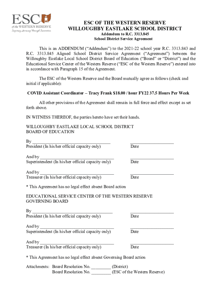 ESC OF THE WESTERN RESERVE WILLOUGBHY WESTLAKE SCHOOL DISTRICT Addendum to R.C. 3313.845 School District Service Agreements is an ADDENDUM (Addendum) to the 202122 school year R.C. 3313.843 and R.C.
