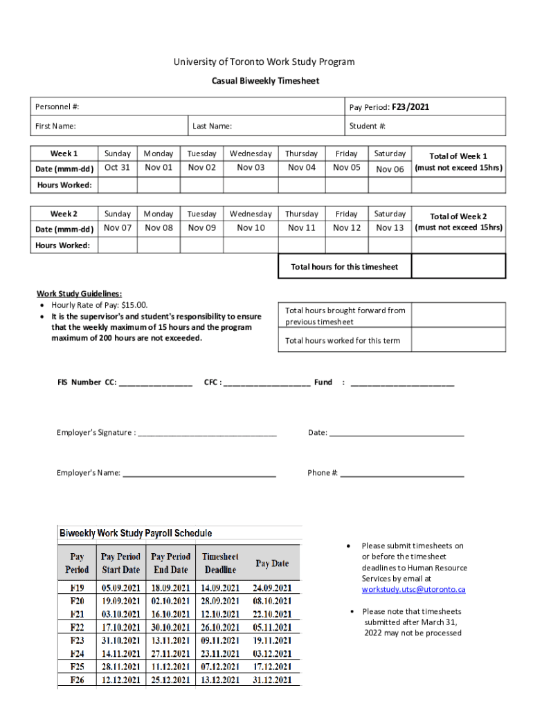 University of Toronto Work Study Program Casual Biweekly Timesheet Pay Period: F23/2021Personnel #: First Name:Last Name:Student #:Week 1SundayMondayTuesdayWednesdayThursdayFridaySaturdayDate (mimed)Oct