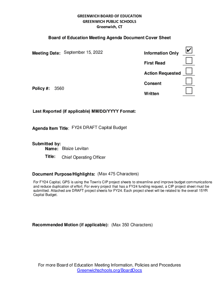 GREENWICH BOARD OF EDUCATION GREENWICH PUBLIC SCHOOLS Greenwich, CT Board of Education Meeting Agenda Document Cover Sheet Meeting Date: September 15, 2022Information Only ___ First Read___Action