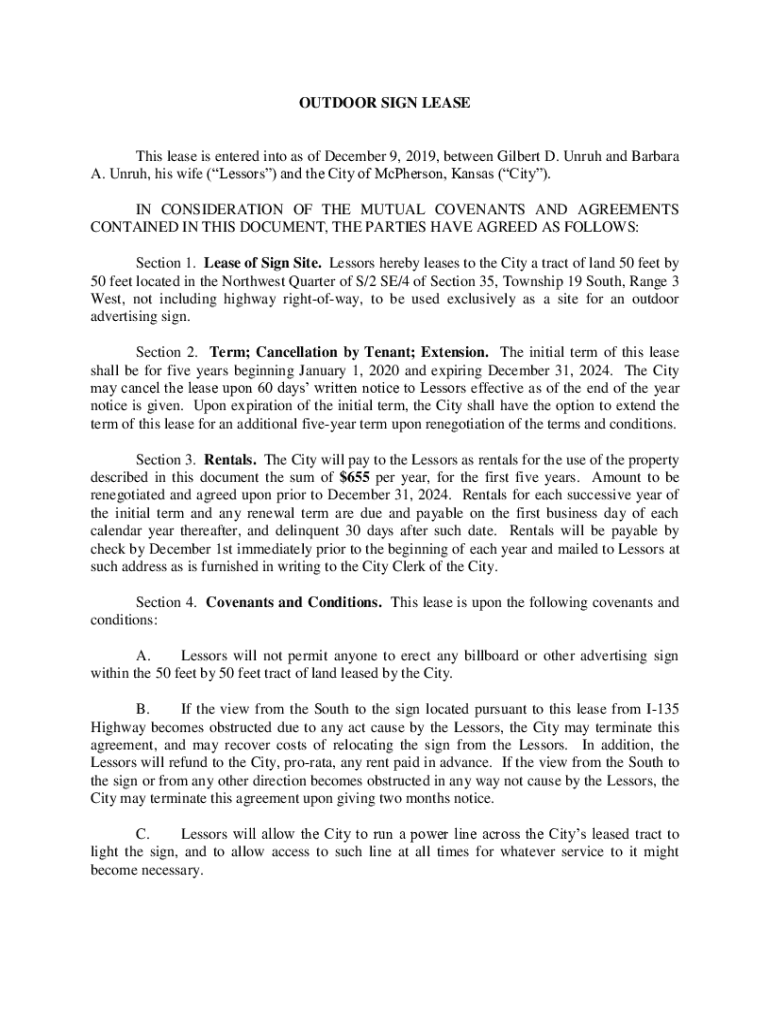 OUTDOOR SIGN Leases lease is entered into as of December 9, 2019, between Gilbert D. Uncut and Barbara A. Uncut, his wife (Lessors) and the City of McPherson, Kansas (City). IN CONSIDERATION OF THE