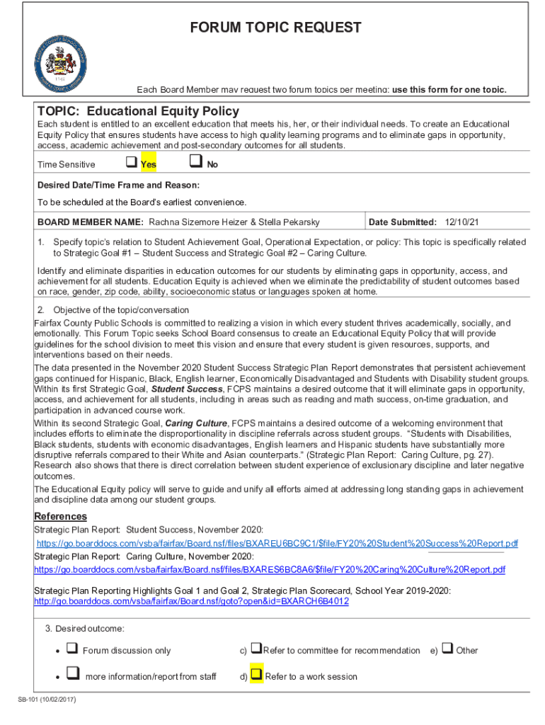 FORUM TOPIC Requested Board Member may request two forum topics per meeting; use this form for one topic.TOPIC: Educational Equity PolicyMap student is entitled to an excellent education that meets