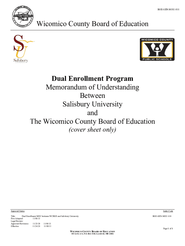 BOEGENMOU018Wicomico County Board of Educational Enrollment Program Memorandum of Understanding Between Salisbury University and The Comic County Board of Education (cover sheet only)Approval Stateside