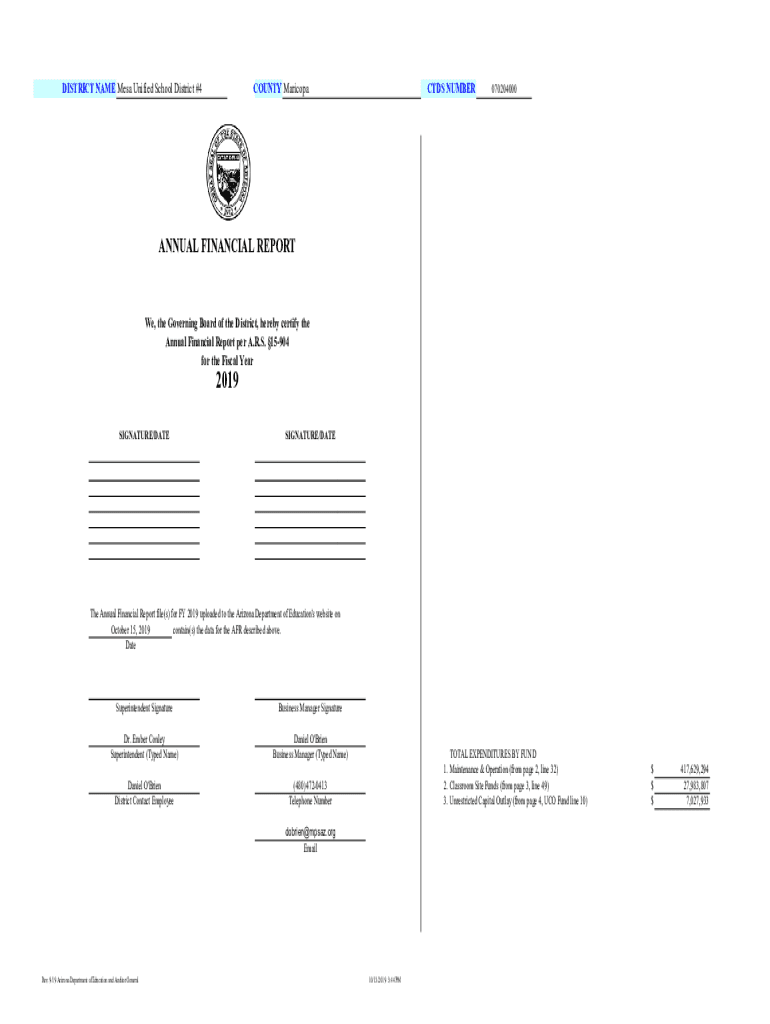 DISTRICT NAME Mesa Unified School District #4COUNTY MaricopaCTDS NUMBER070204000ANNUAL FINANCIAL Report, the Governing Board of the District, hereby certify the