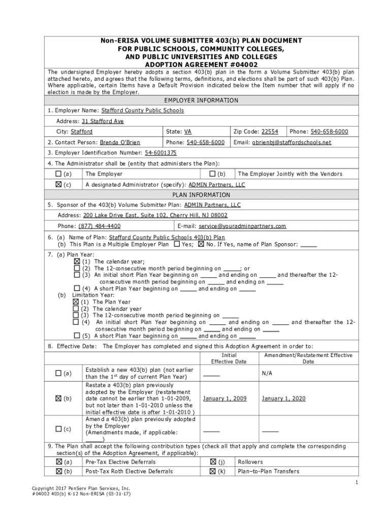 Novelist VOLUME SUBMITTER 403(b) PLAN DOCUMENT FOR PUBLIC SCHOOLS, COMMUNITY COLLEGES, AND PUBLIC UNIVERSITIES AND COLLEGES ADOPTION AGREEMENT #04002 The undersigned Employer hereby adopts a section