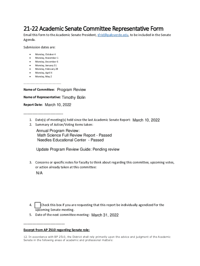 2122 Academic Senate Committee Representatives Foresail this form to the Academic Senate President, sfrid@paloverde.edu, to be included in the Senate Agenda. Submission dates are: Monday, October