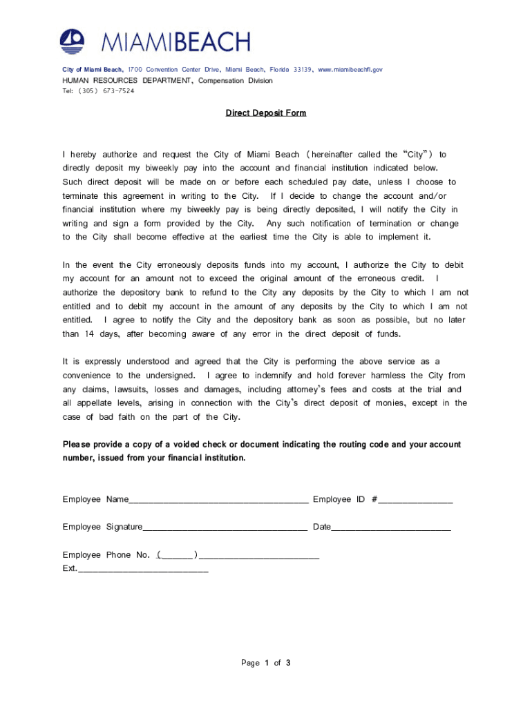 City of Miami Beach, 1700 Convention Center Drive, Miami Beach, Florida 33139, www.miamibeachfl.govHUMAN RESOURCES DEPARTMENT, Compensation Division Tel: (305) 6737524Direct Deposit Form hereby authorize