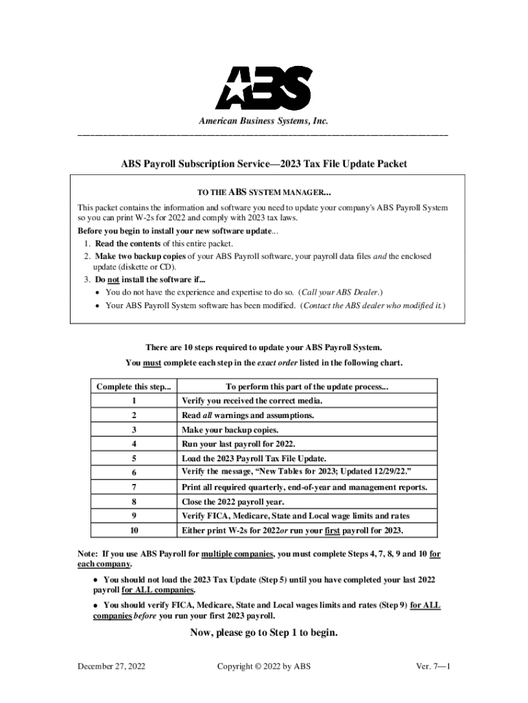 American Business Systems, Inc. ___ABS Payroll Subscription Service2023 Tax File Update Packet TO THE ABS SYSTEM MANAGER... This packet contains the information and software you need to update your