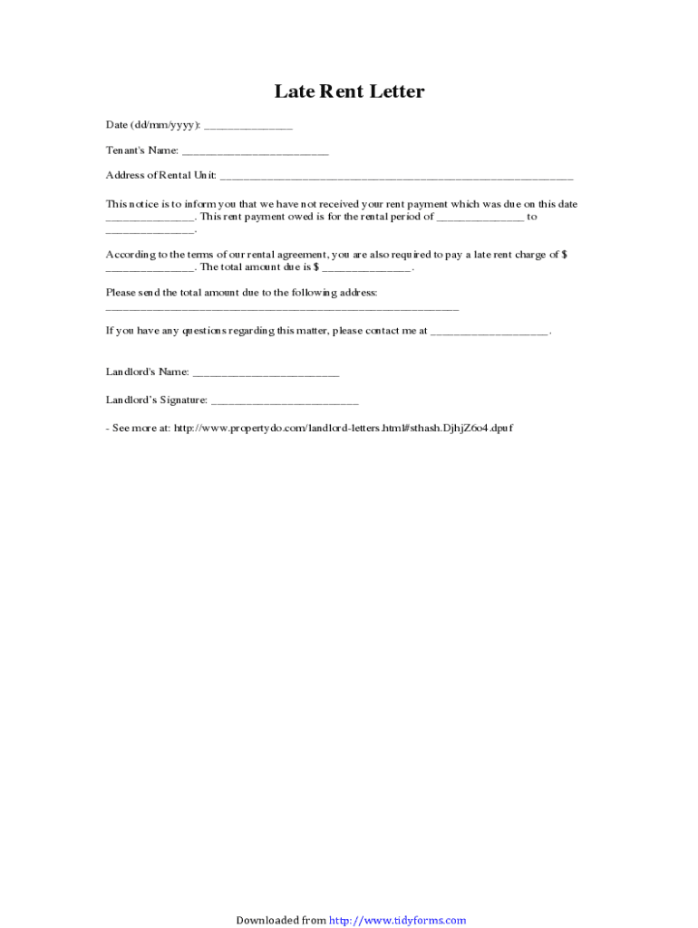 Late Rent Letter Date (dd/mm/YYY): ___ Tenant\'s Name: ___ Address of Rental Unit: ___ This notice is to inform you that we have not received your rent payment which was due on this date ___. This