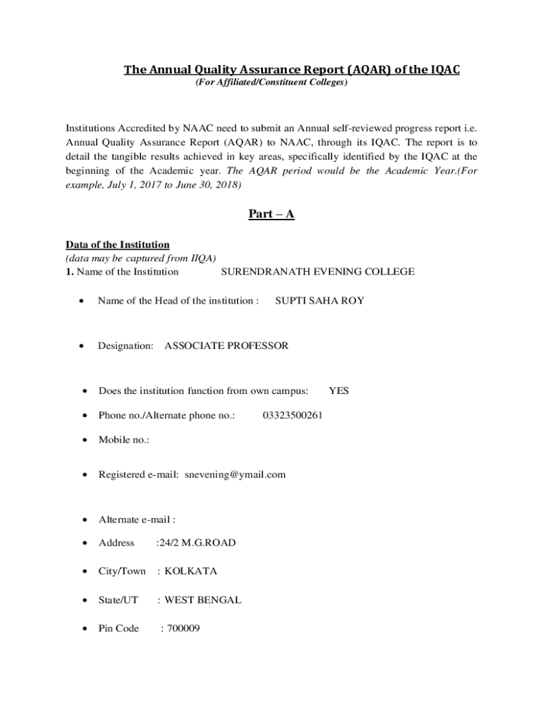 The Annual Quality Assurance Report (AGAR) of the IAC (For Affiliated/Constituent Colleges)Institutions Accredited by NAACP need to submit an Annual self reviewed progress report i.e. Annual Quality