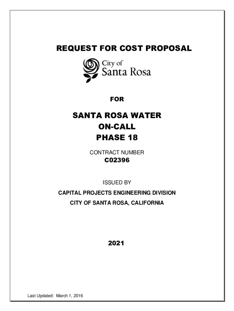 REQUEST FOR COST PROPOSALFORSANTA ROSA WATER CALL PHASE 18 CONTRACT NUMBERC02396ISSUED BY CAPITAL PROJECTS ENGINEERING DIVISION CITY OF SANTA ROSA, CALIFORNIA2021Last Updated: March 1, 2016STATE OF