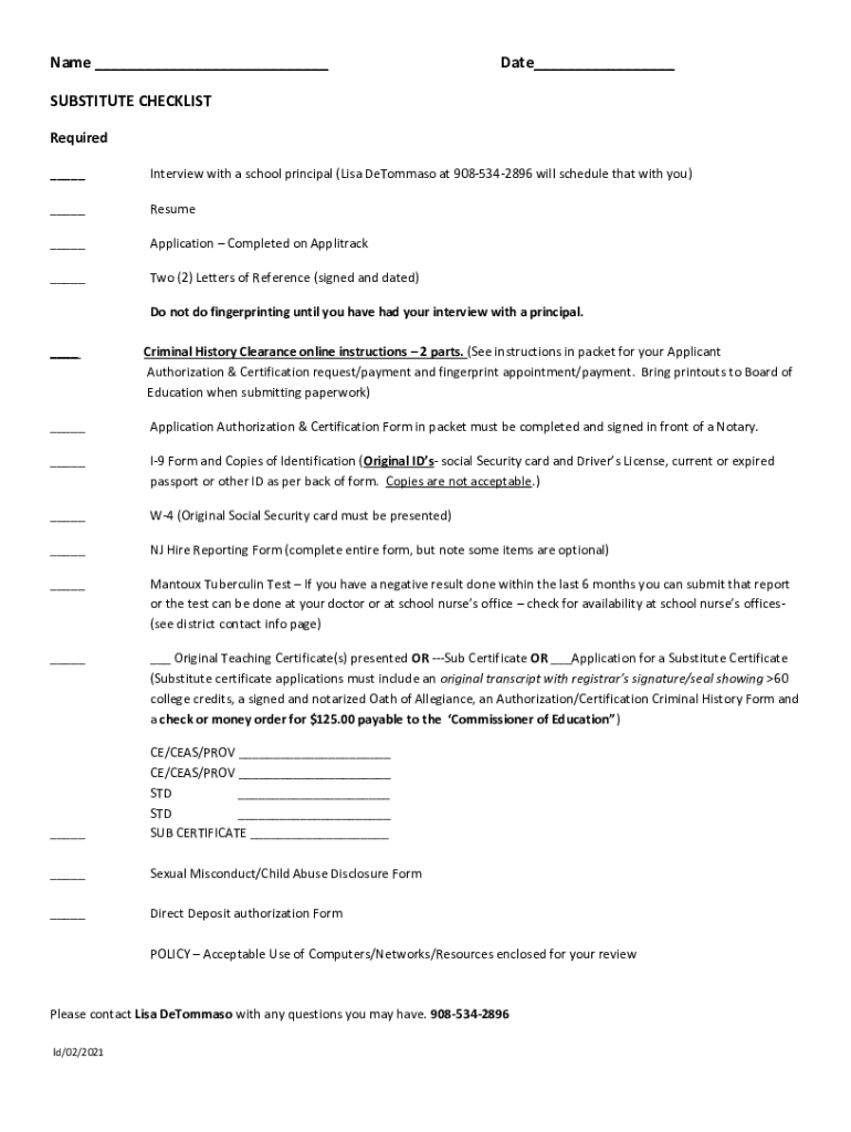 Name ___Date___SUBSTITUTE CHECKLIST Required ___Interview with a school principal (Lisa DeTommaso at 9085342896 will schedule that with you)___Resume___Application Completed on Applitrack___Two (2)