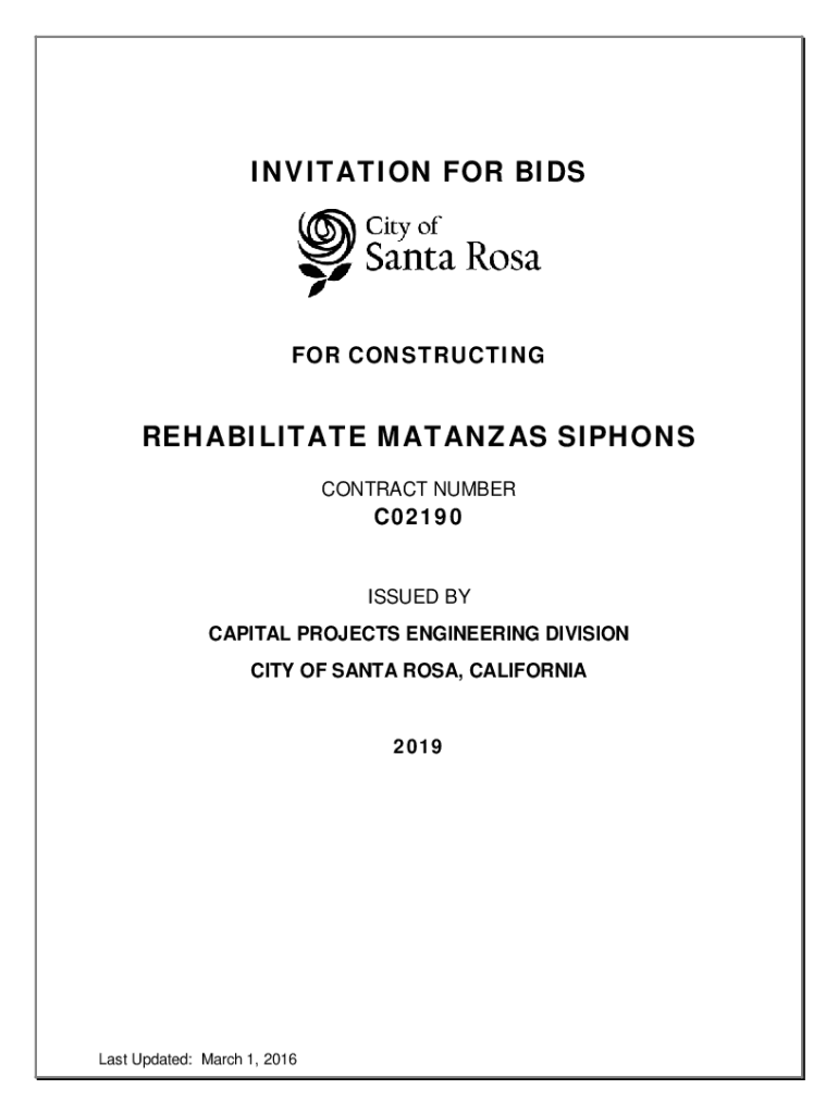 INVITATION FOR BISHOP CONSTRUCTINGREHABILITATE STANZAS SIPHONS CONTRACT NUMBERC02190ISSUED BY CAPITAL PROJECTS ENGINEERING DIVISION CITY OF SANTA ROSA, CALIFORNIA2019Last Updated: March 1, 2016ATTENTION