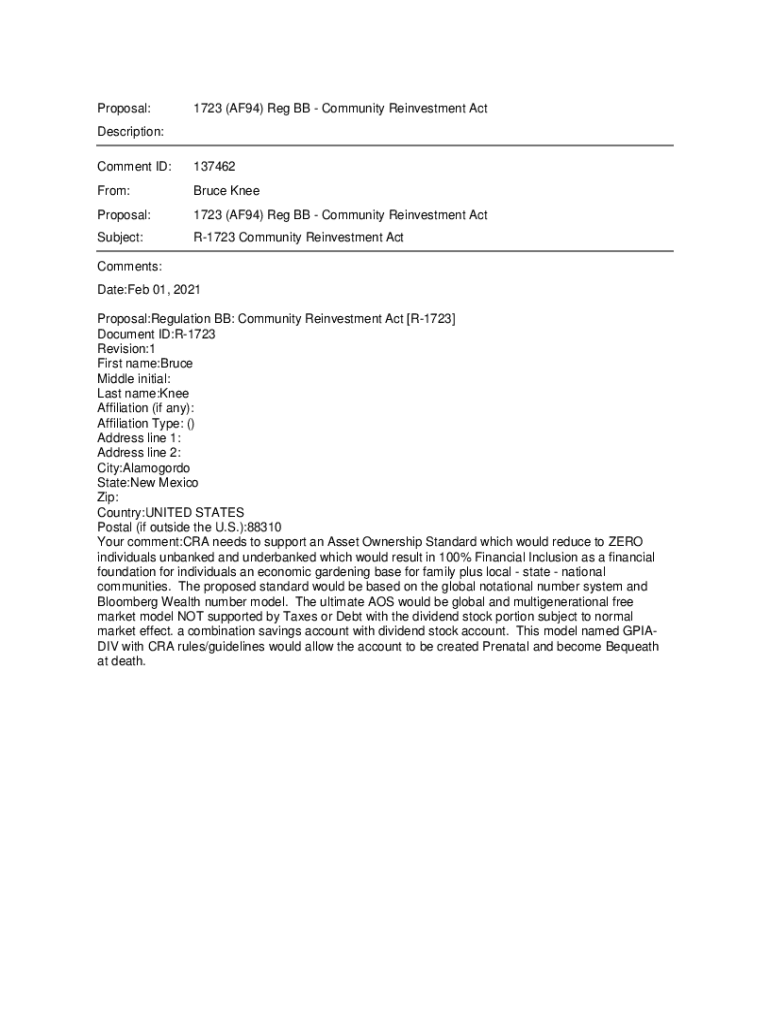 Proposal:1723 (AF94) Reg BB Community Reinvestment Description: Comment ID:137462From:Bruce KneeProposal:1723 (AF94) Reg BB Community Reinvestment Subject:R1723 Community Reinvestment Comments: Date:Feb