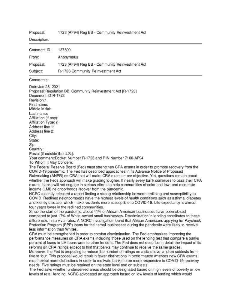 Proposal:1723 (AF94) Reg BB Community Reinvestment Description: Comment ID:137500From:AnonymousProposal:1723 (AF94) Reg BB Community Reinvestment Subject:R1723 Community Reinvestment Comments: Date:Jan