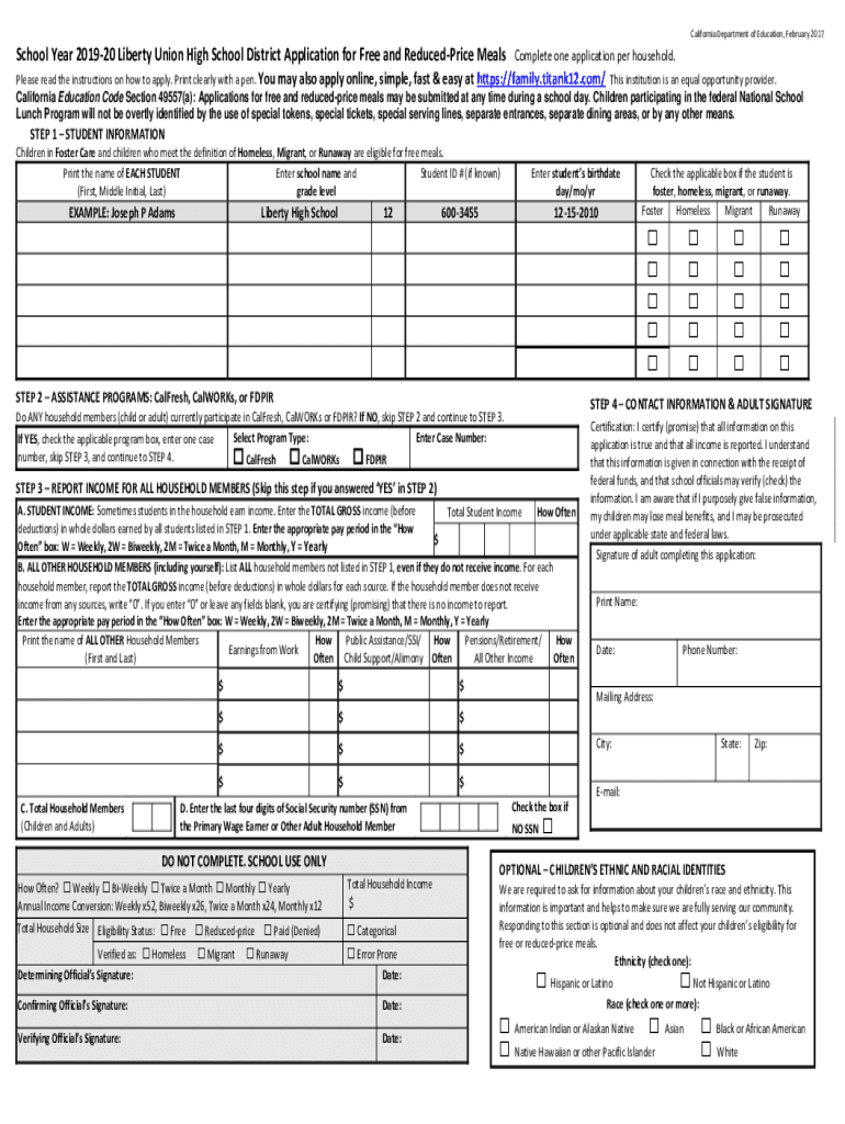 California Department of Education, February 2017School Year 201920 Liberty Union High School District Application for Free and Reduced Price Meals Complete one application per household. Please read