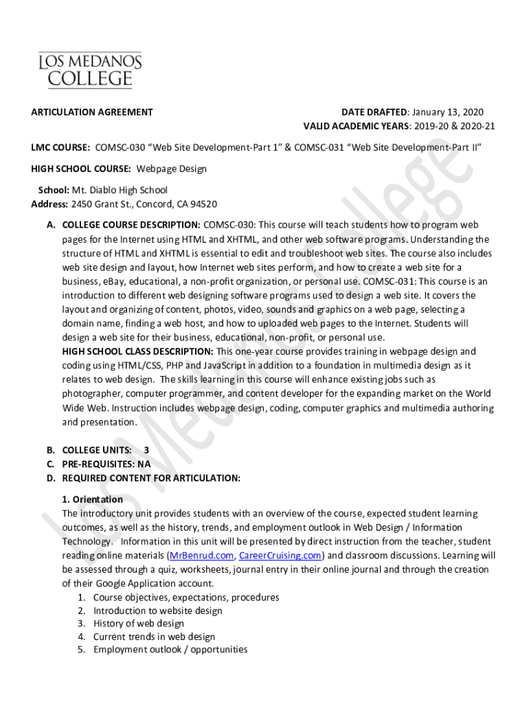 ARTICULATION AGREEMENTDATE DRAFTED: January 13, 2020, VALID ACADEMIC YEARS: 201920 & 202021LMC COURSE: COMSC030 Website Developmental 1 & COMSC031 Website Developmental II HIGH SCHOOL COURSE: Webpage