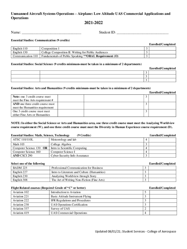 Unmanned Aircraft Systems Operations Airplane: Low Altitude UAS Commercial Applications and Operations20212022 Name: ___Student ID: ___Essential Studies: Communication (9 credits) Enrolled/Completed