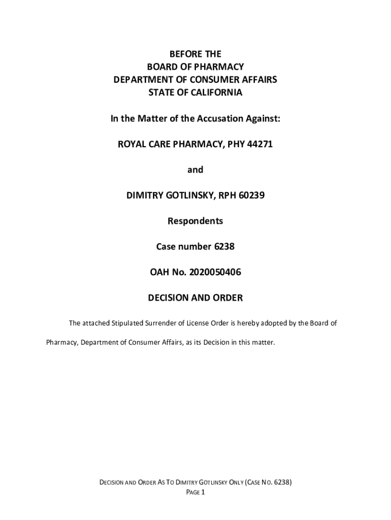 BEFORE THE BOARD OF PHARMACY DEPARTMENT OF CONSUMER AFFAIRS STATE OF CALIFORNIA In the Matter of the Accusation Against: ROYAL CARE PHARMACY, PHY 44271 and DIMITY GOBLINS, MPH 60239 Respondents Case