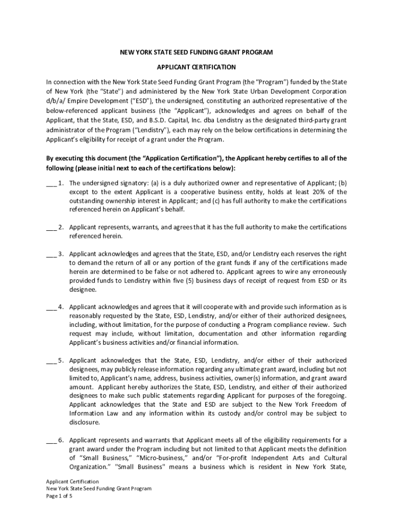 NEW YORK STATE SEED FUNDING GRANT PROGRAM APPLICANT CERTIFICATION In connection with the New York State Seed Funding Grant Program (the Program) funded by the State of New York (the State) and administered