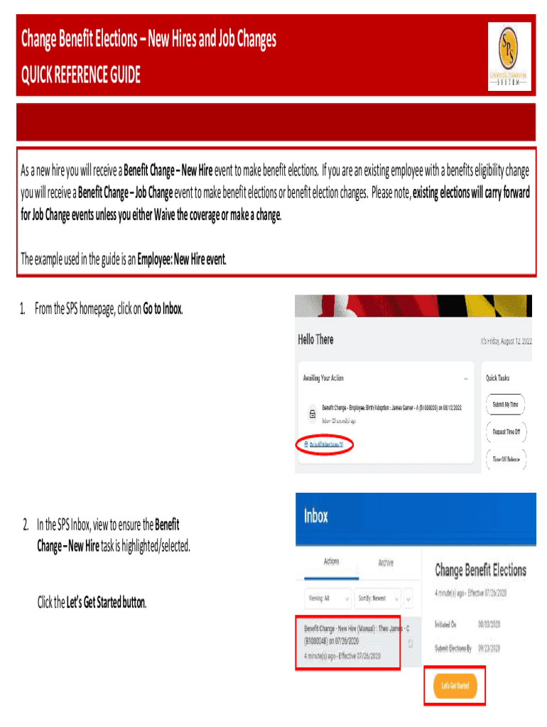 Change Benefit Elections New Hires and Job Changes QUICK REFERENCE GUIDE PROCESS STEPS:EE02As a new hire you will receive a Benefit Change New Hire event to make benefit elections. If you are an existing