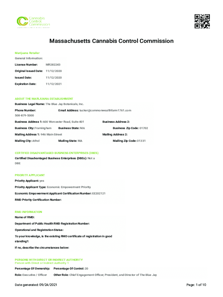 Massachusetts Cannabis Control Commission Marijuana Retailer General Information: License Number:MR282243Original Issued Date: 11/12/2020 Issued Date:11/12/2020Expiration Date:11/12/2021ABOUT THE