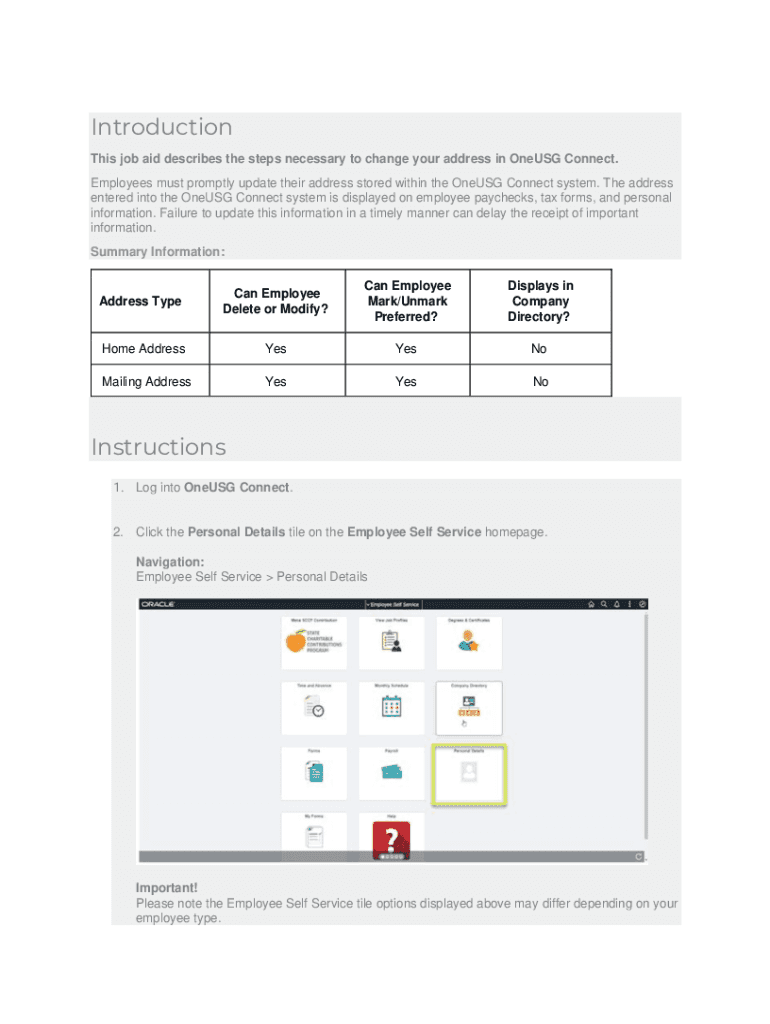 Introduction This job aid describes the steps necessary to change your address in One USG Connect. Employees must promptly update their address stored within the One USG Connect system. The address