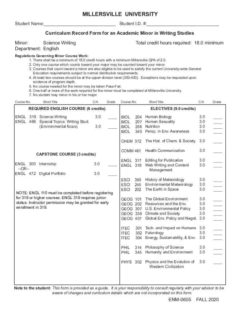 MINERSVILLE UNIVERSITY Student Name:___ Student I.D. #:___Curriculum Record Form for an Academic Minor in Writing Studies Minor:Science WritingDepartment: Englishwoman credit hours required: 18.0