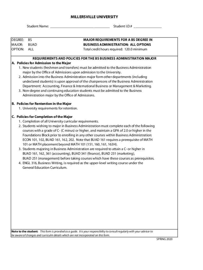 Business Administration students at Millersville University are required to fill out the buad-curriculum-sheetpdf.
