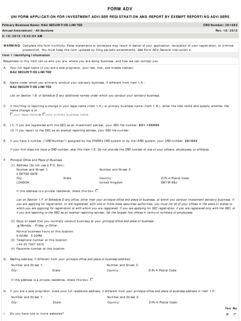 FORM ADV UNIFORM APPLICATION FOR INVESTMENT ADVISER REGISTRATION AND REPORT BY EXEMPT REPORTING ADVISERS Primary Business Name: NAU SECURITIES LIMITED CRD Number: 281683Annual Amendment All Sections