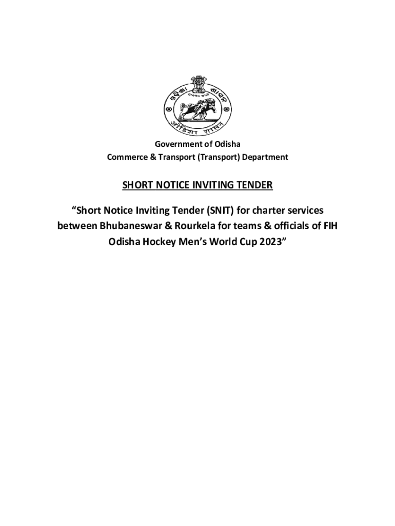 Government of Odisha Commerce & Transport (Transport) DepartmentSHORT NOTICE INVITING TENDER Short Notice Inviting Tender (SNIT) for charter services between Bhubaneswar & Rourkela for teams & officials