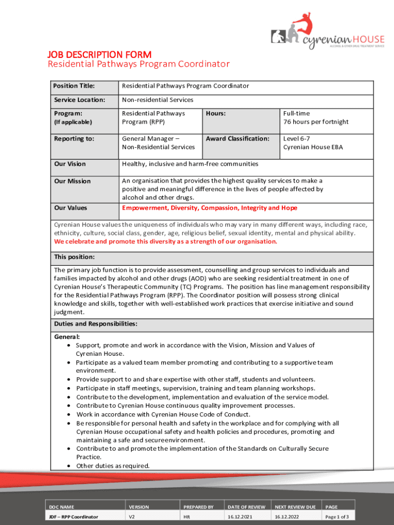 JOB DESCRIPTION FORM Residential Pathways Program Coordinator Position Title:Residential Pathways Program CoordinatorService Location:Nonresidential ServicesProgram:Residential Pathways Program (RPP)Hours:Full