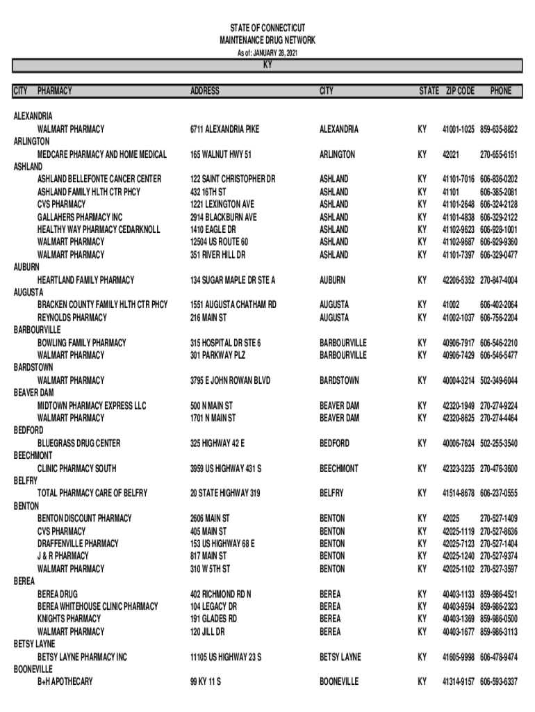 STATE OF CONNECTICUT MAINTENANCE DRUG NETWORK As of: JANUARY 28, 2021KY CITYPHARMACYALEXANDRIA WALMART PHARMACY ARLINGTON MEDICARE PHARMACY AND HOME MEDICAL ASHLAND BELMONTE CANCER CENTER ASHLAND